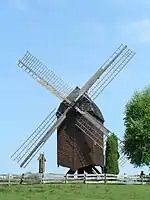 The Alphonse Daudet windmill was built in 2002 (photo: see above) as a replica. The prototype was built in 1813 in Fontvieille near Arles in French Provence. The poet, Alphonse Daudet (1840–1897), immortalised it in the 19th century in his book, Letters From my Mill. In 1935 the "Society of the Friends of Alphonse Daudet" dedicated the mill as a museum and, in 1936, it appeared on a French postage stamp. This type of mill first appeared in the 12th century and is one of the oldest in France.