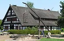 The Rossmühle is probably the largest horse mill (Pferdemühle) in Germany and comes from Hüllhorst-Oberbauerschaft in the district of Minden-Lübbecke. The original was built in 1797 and this replica erected in 1982. It is an octagonal timber-framed building. In the interior, horses walked around in a circle turning a wooden cogwheel with a power of one horsepower (PS) each. The cogwheel, with its 320 teeth and diameter of 32 metres, is the largest known of its type. It drove a stamping mill, used in the production of flax, and a corn mill.