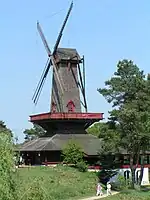 When the museum was expanded in 1987 a replica of a Greek windmill on the Cycladic island of Mykonos was constructed on an artificial island on the site. It is a white tower mill with a pointed roof and twelve sails.