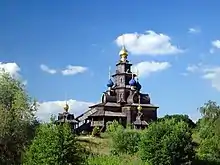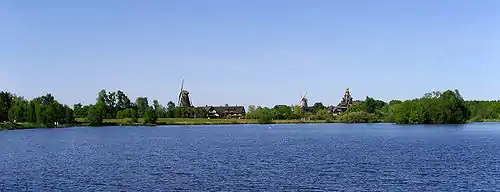 The 27-metre-high stave church on the museum site with its eight gilded domes is a replica of the wooden Russian Orthodox church dedicated to Saint Nicholas. The Muscovite patriarch, Alexy II, formerly head of 100 million Russian Orthodox Christians, opened it in 1995. In the church there is an exhibition with liturgical artefacts (icons, oil lamps, candlesticks, vestments, embroidery, fonts and bibles) from the Moscow patriarchate. There is an additional charge for visiting the interior of this impressive, cathedral-like building, decorated with iconic paintings. The original was built in 1765 as a Transfiguration of Christ Church (Christi-Verklärungskirche) in the central Russian village of Kosljatjewo.