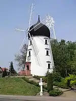A smock mill has stood on the Dorfplatz since 1984 which is based on the historic mill near the castle of Sanssouci in Potsdam. The 40 metre high original was built in 1788, burnt down in 1945 during the final clashes of the Second World War and was rebuilt in Potsdam in 1993. The mill near the royal residence became famous through a legend that its clattering disturbed Frederick the Great. When the king threatened it with compulsory purchase, the miller was referred to the Kammergericht, or Supreme Court, in Berlin. The German name for this type of mill, Galerieholländer ("Dutch gallery mill"), refers to the circular gallery on the fourth story of the mill. The mill thus has enormous dimensions. Inside the Sansoucci mill at Gifhorn, the story of the mill museum is presented.