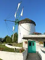 This replica mill was erected in 1993 next to the Greek mill and comes from Torres Vedras in central Portugal. It also represents the type of mill found on the Algarve coast. The mill, with its four triangular sails, is typical of Portugal and the Mediterranean area.