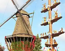 On the square is the "international mill tree". This is a pole, about 30 metres high, on which the state coats-of-arms of all the countries represented by the mills in the museum may be found, as well as wood carvings with milling motifs.