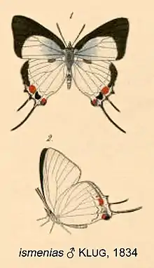Iolaus ismenias, the white sapphire, is a butterfly in the family Lycaenidae. It is found in Senegal, Guinea-Bissau, Burkina Faso, Ivory Coast, Ghana, Togo, Nigeria, Cameroon, the Democratic Republic of the Congo, Sudan, Uganda and Ethiopia.[2] The habitat consists of dry savanna.