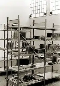 - Archivio (1991) was executed over the duration of Milan's annual festival of the arts, Milano Poesia, curated by Gianni Sassi. "Archivio" showed the process and performance of encasing international daily newspaper cuttings in hundreds of thin slabs of wax and ordering them onto steel shelving. Visitors browsed through the slabs, rearranging them and breaking some. Over the duration of the show the archive was transformed into a collection of disorder. Archivio was reinstalled a year later in Prague.[26] The act of encasing objects in wax would remain a theme in Haeussler's work to this date. Examples are stacks of wax-tablets that encase the laundry of children and adults, arranged into constellations of family relationships, or panels of gauze-curtains and dresses in which the fabrics' color and texture shimmers through the enclosing wax matrix; they appear as large, ethereal paintings.[27]