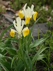 Iris bucharica (also Bukhara iris, corn leaf iris and horned iris) is a species of flowering plant in the family Iridaceae. It is a bulbous herbaceous perennial, from temperate Asia, within Afghanistan, Tajikistan and Uzbekistan. It has long blue green leaves, many flowers in spring, in shades of yellow and white.