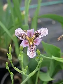 There is also an intergeneric hybrid between Belamcanda chinensis (also Iris domestica) and Pardanthopsis dichotoma (also Iris dichotoma)[27] called the candy lily,[6][13][14] which is also called "x Pardancanda norrisii".[2][14][3] The 'x' in front of the name is to show that it is a man-made primary hybrid between two different genera.[6]