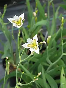 It can reach 60 to 90 cm 60–90 cm (24–35 in) tall.[58] Like I. dichotoma, it has flowers that last for one day but can keep blooming for weeks.[59] It blooms in the summer and has saucer-shaped flowers.[58] They have seedpods between August and October that split to show the black seeds, similar to the blackberry lily (or B. chinensis).