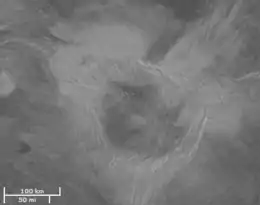 Irnini Mons is a volcanic structure on the planet Venus, and is named after the Assyro-Babylonian goddess of cedar-tree mountains.[2] It has a diameter of 475 km (295 mi), a height of 1.75 km (1.09 mi), and is located in Venus' northern hemisphere.[3] More specifically, it is located in the central Eistla Regio region at (14°0′N 16°0′E / 14.000°N 16.000°E / 14.000; 16.000) in the V-20 quadrangle.[1] Sappho Patera, a 225 km (140 mi) diameter wide, caldera-like, depression tops the summit of Irnini Mons.[4] The primary structural features surrounding Irnini Mons are graben, seen as linear depressed sections of rock, radiating from the central magma chamber. Also, concentric, circular ridges and graben outline the Sappho Patera depression at the summit. The volcano is crossed by various rift zones, including the north-south trending Badb Linea rift, the Guor Linea rift extending to the northwest, and the Virtus Linea rift continuing to the southeast.[1]