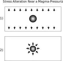 Diagram illustrating the stress transition (1 to 2) from regional compression to radial compression around Irnini Mons, resulting in radial graben