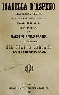 - ↑ Isabella d'Aspeno, melodramma tragico in quattro parti, diviso in tre atti. (libretto published for the 1855 premiere at the Teatro Carcano, Milan). Retrieved 3 December 2015 (in Italian).