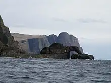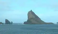 Near the west coast of Suðuroy are many skerries, some islets are all around the island also. This skerry is called Kamarið, which means "The Chamber". Beinisvørð is in the background.
