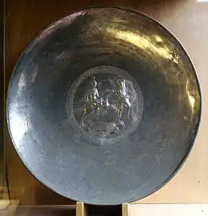 The dish is generally dated to the late sixth century.[2] Stylistically, it is a Byzantine work,[1] possibly produced in Italy.[2] It depicts a scene from either the Gothic Wars[3][4] or the Lombard Wars in Italy.[2][5] The burial of the hoard may be associated with the Lombard capture of Verona in 569.[1]