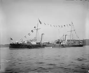 Aretusa was laid down at the Cantiere navale fratelli Orlando (Orlando Brothers' Shipyard) in Livorno on 1 June 1889, and was launched on 14 March 1891. After fitting-out work was completed, the ship was commissioned into the fleet on 1 September 1892.[3] During the 1893 fleet maneuvers, Aretusa served with the 3rd Division of the Reserve Squadron, along with the protected cruisers Vesuvio and Ettore Fieramosca and four torpedo boats. During the maneuvers, which lasted from 6 August to 5 September, the ships of the Reserve Squadron defended against a simulated attack by the Active Squadron, which gamed a French attack on the Italian fleet.[4] Beginning on 14 October 1984, the Italian fleet, including Aretusa, assembled in Genoa for a naval review held in honor of King Umberto I at the commissioning of the new ironclad Re Umberto. The festivities lasted three days.[5]