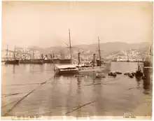 The keel for Coatit was laid down at the Castellammare shipyard on 8 April 1897 and her completed hull was launched on 15 November 1899. After completing fitting-out work, the new cruiser was commissioned into the Italian fleet on 1 October 1900. She proved to be too slow and short-legged to be useful as a fleet scout, which limited her active duty career.[3] She served in the main fleet in 1902–1904, during which time the fleet was kept in a state of readiness for seven months. For the remaining five months, the ships had reduced crews.[4][5] In 1904, the ship was transferred to the Red Sea and stationed in Italy's colony in Eritrea along with the corvette Cristoforo Colombo, the gunboat Volturno, and the aviso Galileo[6] Coatit was assigned to the hostile force that was tasked with simulating an attempt to land troops on Sicily during the 1908 fleet maneuvers.[7]