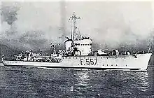In 1949 Sagittario was reclassified as corvette. She lost her middle 100 mm single mounting and torpedo launchers and was fitted with six 40 mm AA cannons and an anti-submarine Hedgehog mortar. When Italy joined NATO, Sagittario's pennant number was changed to F557.[25]