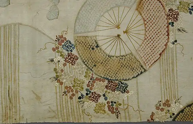 Tsujigahana (lit. "flowers at the crossroads") was a popular dyeing method in the Muromachi (1336-1573) to early Edo period (1603-1867),[7][8] before it fell out of fashion and its method of production was lost. The technique utilised stitched resist dyeing (nuishime shibori), which was then elaborated upon with hand-painted dyework, typically in floral motifs. Gold and silver leaf and embroidery were also used to embellish the designs.[9][10] However, little is known about the original meaning of the word 'tsujigahana', or the technique's original method of production, despite the knowledge of its combined techniques. By the beginning of the 17th century, other styles of dyeing and surface design (such as yūzen) had become increasingly fashionable and tsujigahana vanished, leaving little trace of how the designs were created.[11][12]