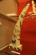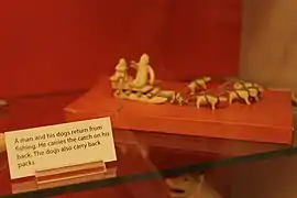 The museum contains some 1,300 items dating from the 1930s to the present day including sculptures,[5] artwork, tools used by the natives of this area of Canada. Some artifacts are made of stone, whale bone or ivory.[6] The museum has exhibits about the Dorset and Thule cultures.[7][8] Among the Inuit-related exhibits are antique weapons, hunting equipment and wooden kayaks designed to navigate the Arctic Ocean.[9][10] The museum also has exhibits on Arctic wildlife including animals such as Polar Bears, Muskox and Walrus.[11][12] The museum has a section of books about the animals that inhabit the Arctic.[13][14] The museum also preserves archaeological remains.[10]