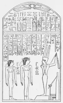Iuhetibu Fendy (also written Jewhetibew Fendy[1]) (Ancient Egyptian: Iwḥ.t-ibw Fnd)[2] was an ancient Egyptian princess of the Thirteenth Dynasty. She was the daughter of king Sobekhotep III and of queen Neni. Iuhetibu Fendy is known from two sources. She appears on a rock-cut stela in the Wadi el-Hol and she appears on a stela from Abydos now in the Louvre in Paris (C8).[1] On the stela she is shown together with her sister Dedetanqet (also written Dedetanuq) in front of the fertility god Min. Her two names are written within a cartouche (a ring that enclosures the name), a privilege that was given in this time very rarely to royal women and points to a special status of Iuhetibu Fendy. Iuhetibu Fendy bears a double name. The first name Iuhetibu was also the name of Iuhetibu Fendy's grandmother. Naming children after grandparents was not uncommon in Ancient Egypt.[1] Fendy is a nickname meaning "nose".[3]