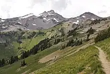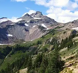 Ives Peak, elevation 7,920+ ft (2,410+ m), is located in the Goat Rocks on the border of Lewis and Yakima Counties, in the U.S. state of Washington. Ives Peak is within the Goat Rocks Wilderness and the McCall Glacier on its eastern slopes. Additionally, the Pacific Crest National Scenic Trail is near the west slopes of the peak.[3] Precipitation runoff from the peak's east slope drains to the Tieton River, whereas the west slope drains into the Cispus River. Ives Peak ranks as the fourth-highest peak in the Goat Rocks Wilderness.[4]