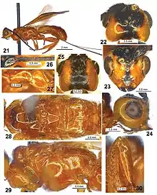Body length of female is 9.7 mm. Head smooth, high and transverse. Occiput strongly concave. Ocelli arranged in slightly obtuse triangle. Frons slightly concave. Eyes glabrous. Clypeus almost flat laterally. No malar suture. Blackish antennae weakly setiform with 35 segments. Mesosoma not depressed. Pterostigma of fore wing rather narrow. Fore femur thick and short. Claws are simple, large, short and strongly curved. Mesosoma brownish yellow and metasoma light reddish brown. Yellowish head with large black spot on frons. Legs brownish yellow to light reddish brown. Fore and hind wings are entirely distinctly infuscate with yellowish tint basally.[1]