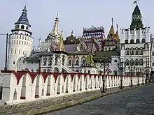 The Kremlin in Izmaylovo is a unique center of culture and entertainment, based at the famous Izmaylovo Vernissage. It is built in a architecture style of Old Muscovite Russia which consists of colorful ornament and wooden architecture in the Russian style. It is an imitation of Moscow based on sketches from the 14th-17th centuries.[5] It is supposed to depict many elements of Old Russian architecture as it looked like in pre-Petrine times. It is also inspired by drawings of Russian fairy tales.[6] This complex is used for civil weddings as it has a wedding palace, a restaurant and bars. However, it is also used as an amusement park/open-air museum for children on the theme of 'Old Russia'. There is a reconstruction of a wooden Russian church that used to dot the Russian countryside before the Russian Revolution but it is not used for weddings. There is also a big market that sells souvenirs amongst other things.