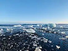 Jökulsárlón (Icelandic pronunciation: [ˈjœːkʏlsˌaurˌlouːn] ; literally "glacial river lagoon") is a large glacial lake in southern part of Vatnajökull National Park, Iceland. Situated at the head of the Breiðamerkurjökull glacier, it developed into a lake after the glacier started receding from the edge of the Atlantic Ocean. The lake has grown since then at varying rates because of melting of the glaciers. The glacial front is now about 8 km (5.0 mi) away from the ocean's edge and the lake covers an area of about 18 km2 (6.9 sq mi). In 2009 it was reported to be the deepest lake in Iceland, at over 284 m (932 ft), as glacial retreat extended its boundaries.[1] The size of the lake has increased fourfold since the 1970s.[2][3][4][5]