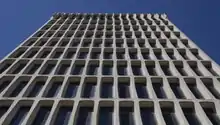 The building is a single rectilinear volume set on a podium-like ground floor, surrounded by a concourse. The exterior walls are concrete, and the ground floor is polished granite.[3] All four sides of the building are wrapped with a uniform exterior grid that frames the window openings with rows and columns of T-shaped concrete sections.[3] The concrete openings taper to create a vertically oriented oblong hexagonal shape. This strategy "both softens and animates the building with enriched patterns of light and shadow".[1]