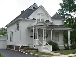 J. Claude Rumsey House, also known as the Rumsey-Nomanson House, is a historic home located at 709 Michigan Avenue in Lowell, Lake County, Indiana. It was built in 1906, and is a 2-story, Queen Anne stick built home with a cross-gable roof. It sits on a concrete foundation, which was quite modern at the time, and features a round corner tower with fishscale shingles and a wraparound porch.[2]:2–3