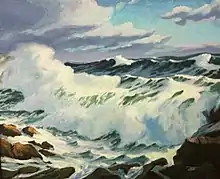 Almost all of Barber's landscapes and seascapes were initially painted or sketched on-site (i.e. en plein air). Barber's MFA thesis was a study of methods of plein air painting on the Oregon Coast.[16] In the introduction to his thesis, Barber shared the following observation about the value of plein air painting: "Painting out-of-doors, where the artist can respond to the influence of the elements, is most rewarding in terms of successful production. This does not imply that changes will not be made in the studio nor that nature will not be altered by design for effect; but the subject matter is of great importance. In other words, painting is not purely for design alone, but the design is for the purpose of enhancing the subject matter."
