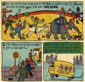 It purported to be the hand-illustrated, hand-written diary of a young boy, supposedly Mendelsohn himself in his extreme youth. Thus, it was both written and illustrated as though by a small child—which is not as easy to do as some who have had the misfortune of growing up might think. Week after week, Mendelsohn described trips to the circus, fishing expeditions, visits to members of his extended family, and all sorts of other adventures kids have, in a style simulating that of an actual kid—except, of course, for the fact that it was professionally rendered in every way. Unfortunately, professional work is sometimes best recognized by another professional, or at least by someone who knows what to look for—or at the very least, by someone who could see that this was a spoof, and that childishness was a schtick and not a natural state for Mendelsohn. King Features received complaints from those who didn't "get" it and thought the company was publishing the work of an actual child—or, in the case of those who noticed the byline ("by Jacky Mendelsohn, age 32+1⁄2") by an adult whose abilities hadn't progressed since childhood. Often, parents, mistaking the strip's intent, would encourage their own children to send in submissions to what they thought was a kids' participation feature. But that's not why it folded quickly, Mendelsohn said in a later interview. It's simply that a Sunday-only comic is more expensive to produce than a daily, and King just couldn't afford it anymore.[3]