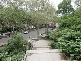 A curved concrete stair, which separates the dance floor terrace to the south and the promenade to the north, leads upward from 148th Street and Bradhurst Avenue to a landing at Edgecombe Avenue, just south of 150th Street. A path winds upward from the intersection of 150th Street and Bradhurst Avenue to the same landing. An additional path leads from 153rd Street at Bradhurst Avenue to Edgecombe Avenue's intersection with 155th Street and the 155th Street Viaduct.[17] The paths predate the WPA renovations in 1936. The WPA removed some of the original paths to make way for the recreational fields, while repaving these paths with hexagonal pavers. Some of the paths subsequently were repaved in asphalt.[16]