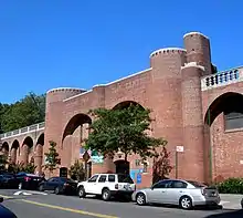 The recreation center is built on a slope east of the pool between 146th and 147th Streets. The building contains a facade of brick in common bond and is arranged in a roughly rectangular shape, with its longer axis running north-south. It has a two-story primary facade on Bradhurst Avenue to the east and a one-story rear facade facing the pool to the west. The rear facade corresponds to the second story of the bathhouse.[17] The bathhouse is designed with cylindrical shapes and Romanesque details.[22][23][24] The decorative elements include stone corbels, courses, window sills, and rooftop balustrades.[25] The design, more ornate than the other ten pools built as part of the same 1936 WPA program, has been compared to a medieval fortification.[24][20]