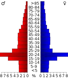 Of the 25,538 households, 23.0% had children under the age of 18 living with them, 35.5% were married couples living together, 10.2% had a female householder with no husband present, 50.6% were non-families, and 35.1% of all households were made up of individuals. The average household size was 2.20 and the average family size was 2.87. The median age was 29.1 years.[13]