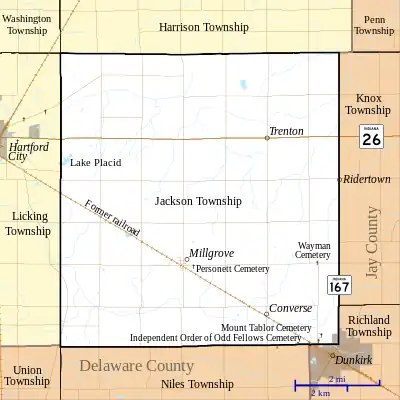 3. "Jackson Township, Blackford County, Indiana". Geographic Names Information System. United States Geological Survey. Retrieved March 1, 2020.