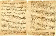 John Frelinghuysen died in 1754, and at the age of twenty, Hardenbergh married Frelinghuysen's widow, Dinah Van Bergh (c.1723–1807) on 18 March 1756 at Raritan, New Jersey. She had two children with Frelinghuysen before his death.[3] Born in Amsterdam, Dinah was the daughter of Louis Van Bergh, a wealthy merchant who was "engaged in East India trade."[9]: p.80 Hardenbergh proposed as Dinah was strongly considering returning to the Netherlands with her two children.[9]: p.81 Her diary, dating from February 1746 to late 1747, is held by Special Collections and University Archives, at the Archibald S. Alexander Library of Rutgers University.[4] Hardenbergh and his wife had nine children: Maria (born 1757–1789), Laura (born 1757–1785), Johannes (1759–1798), Elinor (born 1760), Dina (born 1762), Jacob Rutsen (1763–1764), Rachel (born 1765–1845), Jacob Rutsen (born 1768), and Lewis (1771–1810).[3][10] Hardenbergh's step-son, Frederick Frelinghuysen (1753–1804), served in the Provincial Congress of New Jersey, state legislature, and was elected a United States Senator. He also served as a military officer in the Revolution and in the Whiskey Rebellion (1794) when he attained the rank of major general.[11]