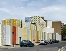 Her 2012 public artwork Wrapper can be seen at the Edgware Road (Circle line) Tube station in London.[4][2] Art on the Underground commissioned Poncelet to produce designs for the 1,500 square metres (16,000 sq ft) of vitreous enamel cladding that would become the outer shell of a new substation connected to the station.[5] The work was unveiled in November 2012, a mosaic of 700 decorated panels of various patterns inspired by local history.[6][7]