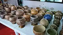 There is no major industry in the municipality except for the Mecoacán oil field. Manufacturing is limited to handcrafts and food processing by small family businesses.[1] One known food industry here is the production of cured meats such as head cheese and longaniza sausage.[4] The main local handcraft is the drying and decoration of gourds which were traditionally used for storage and food service, but today are mostly created for tourists.[1] The gourd, called a jicara, is traditional important as a vessel for chocolate. Today, it is still traditional to serve a chocolate drink called pozol in these gourds.[6]
