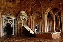 The fort is one of the finest examples of Afghan architecture in India.[6] The main entrance of the mosque is through the eastern entrance. The entire area of the mosque is 7,744 square metres (83,360 sq ft), built on an elevated platform 4.6 m (15 ft). The inscriptions on the eastern doorway to the porch indicates that the mosque was modeled on the basis of Mosque of Damascus.[7] The doorway also has marble jambs and lintels which are atypical of Hindu structures. The entry via eastern entrance leads to a large courtyard interspersed with colonnaded verandas on the three sides. The pillared verandas leads to the prayer halls which is covered with pillars with 58 small domes and three large domes. The prayer hall is full of arches. The central altar (called mihrab) is decorated with verses from Quran. The raised pulpit at the centre has a miniature pulpit made of marble. There are two entrances in the northern wall, one leading to the courtyard and other to the prayer hall.[8]