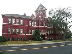 The brick school was built in the Victorian Romanesque style. The symmetrical front façade was organized into five bays, with the central and end bays projecting outward and the other two receding.[2] The entrances were topped with semi-circular arches, and the structure boasted a variety of window shapes and sizes. The elaborate brickwork, multi-planed roofline, and the red brick tower conveyed the importance the community attached to public education.[6] An addition to the original school was built in 1900.[3]
