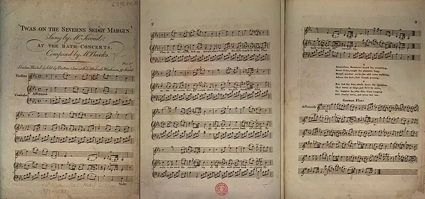 26. Brooks, James (1795). Twas on the Severns sedgy margin. / Sung by Mrs. Second at the Bath concerts, ; composed by Mr. Brooks. London: Preston & Son. British Library: Music Collections G.296.ee.(3.), Music Collections DRT Digital Store G.296.ee.(3.).