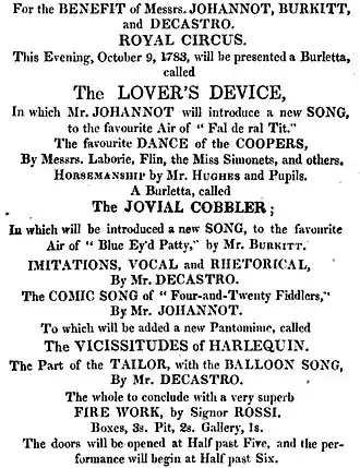 7. Decastro, Jacob (1824). The memoirs of J. Decastro, comedian. In the course of them will be given anecdotes of various eminently distinguished characters... Amongst others are Dr. Johnson, Garrick, Foote,...accompanied by an analysis of the life of the late Philip Astley. Also an accompanying History of the Royal circus, now the Surrey theatre; and an historical sketch of Sadler's Wells. Likewise scarce theatrical advertisements, from Garrick's first attempt in Goodman's-Fields... To which will be added The origin of poetry; A chapter on Bent's, &c... London: Sherwood Jones & Company. pp. 22–23.