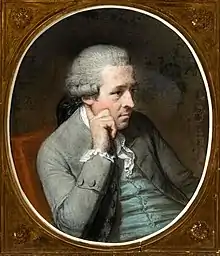 Byres was a painter and an adept designer, whose Vanvitellian design for a palazzo facade won a prize from the Accademia di San Luca in 1762.[5] As an architect, his clients included the Duke of Gordon, Sir Lawrence Dundas and the College of Physicians in Edinburgh.[3] In Rome members of his circle were drawn by Angelica Kauffman in a sketchbook she used from 1762 to 1764: the portraits include the English painter Nathaniel Dance, Gavin Hamilton, and the abbé Peter Grant.[6] By 1764 he was so well acquainted with the ancient sites and the cabinets of collectors that he took about a party of colonial Americans, including Samuel Powel of Philadelphia, who unlike his British peers, took assiduous notes.[7] Other clients in his role as cicerone included Edward Gibbon, Charles Townley, the Dukes of Northumberland and Grafton, the Duke of Hamilton and Lord Clive.[3] Byres, as well as some others British residents in Rome such as Thomas Jenkins and Colin Morison, worked as an art dealer, working with important European collectors.