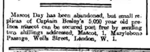135. "Mascot Day Has Been Abandoned". The North Wales Chronicle and Advertiser for the Principality. Bangor, Gwynedd, Wales. 17 August 1917. Retrieved 14 October 2019.
