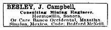 A trade advertisement listing J. Campbell Besley as a Mining Engineer, Mining and Scientific Press, Volume 102, 6 May 1911.