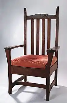 Chapman-Taylor believed that a hand finished technique using an adze gave a "woody character" emphasised the handmade nature of the work, reflecting light to add "interest and beauty" to the wood with no further need for decoration or embellishment. Richly coloured, dense jarrah was a timber he used so extensively in his houses and furniture that he was known as 'Jarrah Taylor.' Chapman-Taylor's distinctive approach using an adze by hand, and the Arts and Crafts principles of simplicity and honesty is evident in the joinery and overall design of a chair made in 1910.[2]