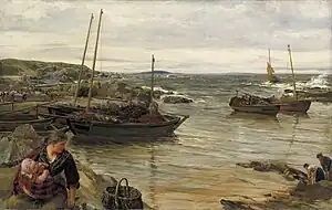 In 1857, Hook left London to settle in rural Surrey around Godalming. In 1866 he built his country house "Silverbeck" near Churt where he lived for the rest of his life.[2] He was a frequent traveller, however, and searched out picturesque coastal areas in Scotland, Wales, Devon and Cornwall, and also abroad in Brittany and the Netherlands. The more remote and unknown the place the better. There he painted en plein air but put the final touches to each picture back home.[3]