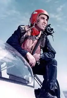 Jabara joined the Boy Scouts, eventually becoming an Eagle Scout.[5] At an early age, he was set on becoming a pilot, "I used to read articles about [Eddie] Rickenbacker and all these novels you read about air combat, and I guess from the sixth grade it was my ambition to be a fighter pilot."[6] He worked at his parents' grocery store[7] and graduated from Wichita North High School in Wichita, Kansas in May 1942. Standing five feet, five inches (165 cm) tall,[8] Jabara was short for a potential fighter pilot (and was reportedly required to wear corrective eyewear[7]), but this did not prevent him from immediately enlisting as an aviation cadet of the United States Army Air Forces at Fort Riley, Kansas.[9] In an attempt to improve his eyesight for flying, he ate 20 carrots a day in the mistaken belief that this would improve his vision.[10] After attending four flying schools in Texas, he received his pilot's wings and a commission as second lieutenant at Moore Field, Texas in October 1943.[9][11] Jabara with his wife, Nina, had four children: James William (b. 1949), Carol Ann (b. 1950), Cathy (b. 1952), and Jeanne (b. 1957).[12][13][14]