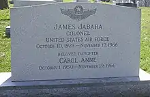 While traveling to Myrtle Beach, South Carolina, where his family would stay while he returned to combat in Vietnam, Jabara and his 16-year-old daughter Carol Anne died in a car accident in Delray Beach, Florida, on 17 November 1966.[3] The Jabara family were in two cars that day, on their way to a new home in South Carolina where his wife Nina and their children—James Jr., Carol Anne, Jeanne, and Cathy—would reside during Jabara's combat tour. Carol Anne was driving a Volkswagen with her father as a passenger in the back seat. She lost control of the car going through a construction zone, when she initially veered onto a grass median.[3] She swerved back onto the highway but during the rapid turn, she lost control and the vehicle returned to the median where it rolled several times.[35][36] Jabara sustained head injuries and was pronounced dead on arrival at a Delray hospital, and Carol Anne died two days later. A memorial service was held for Jabara at Homestead Air Force Base with a missing man formation fly-by.[37] Jabara and his daughter were buried together in a single grave at Arlington National Cemetery.[38][39]