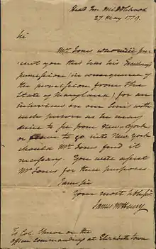 He was paroled in January 1777, then released from parole in March 1778. Having sufficiently impressed George Washington, he was appointed aide as secretary to the commander-in-chief in May 1779. McHenry was present at the Battle of Monmouth. In August 1780, he was transferred to Lafayette's staff, where he remained until he retired from the army in the autumn of 1781.[7][8]